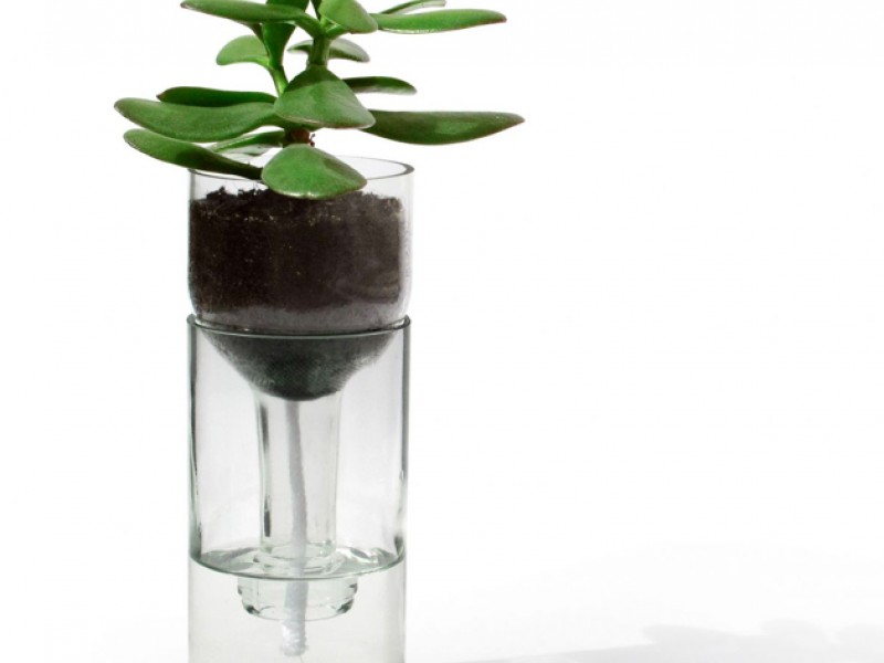 Ja, "self watering bottle" ist ein selbstvewässernder Blumentopf und besteht tatsächlich aus einer echten, transparenten Weinflasche. Der untere Teil der Flasche ist Wasserresservoir und im obernen Flaschenteil, der gestülpt auf das untere gesetzt wird, findet ihre Pflanze seinen Platz.